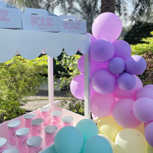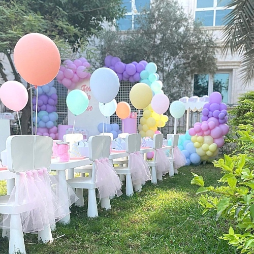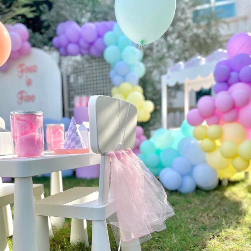 تم تجهيز طاولة الأطفال ببالونات الهيليوم الباستيل وتنورات الكراسي الباستيل والهدايا