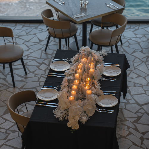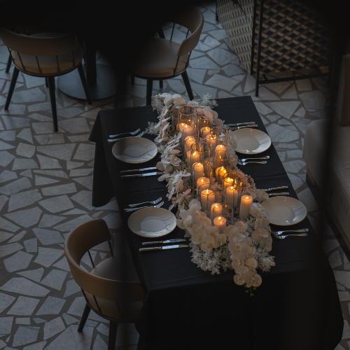 مجموعة رئعه من الفازات بداخلها الشموع الطبيعيه، مع تزييين الطاولة كاملا بزهور الاوركيد الانيقه